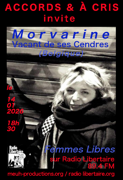 Morvarine Pour sa 16ème émission, Accords & à Cris a rencontré Morvarine, la chanteuse du groupe belge Vacant de ses Cendres, en concert pour la Boum punk de Noël organisée par René Binamé. Au programme : musique, politique belge et féminisme. |
